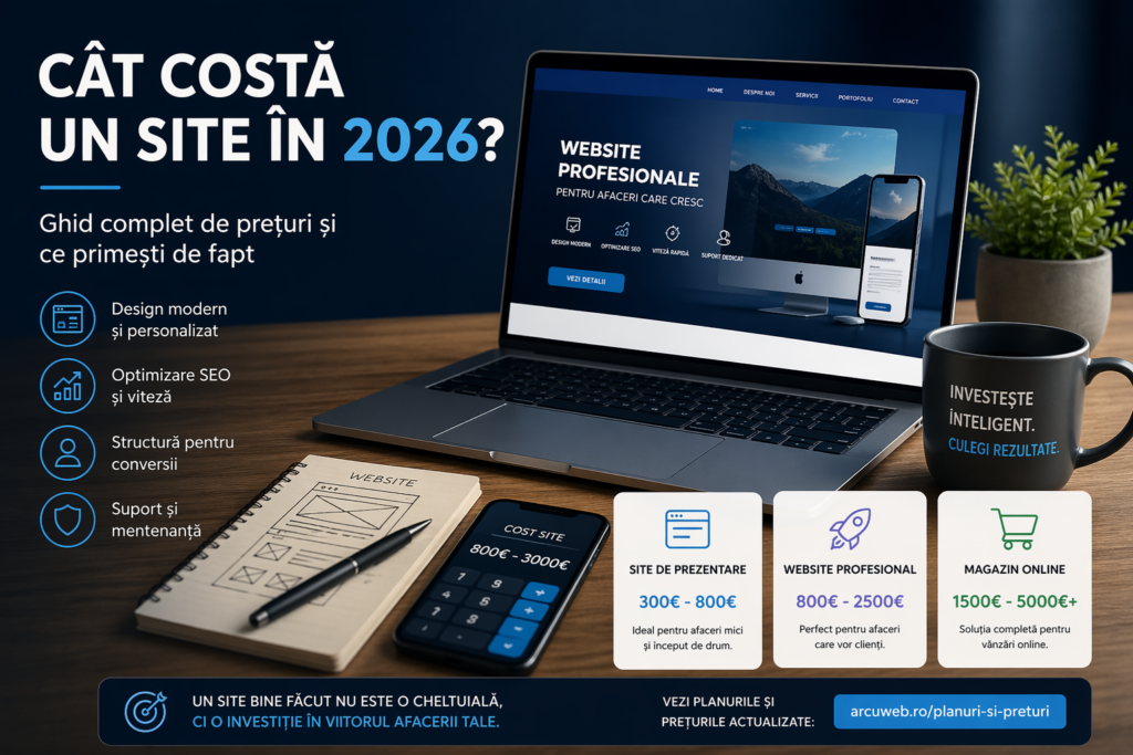 Un site în 2026 costă, în general, între 500€ și 3000€, în funcție de complexitate, design și optimizare SEO. Pentru un website profesional care aduce clienți, investiția începe de obicei de la 800€ – 1500€.